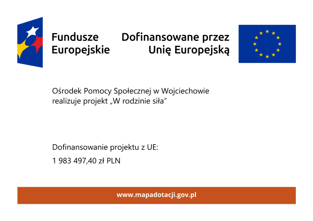 Projekt „W rodzinie siła” realizowany jest przez Ośrodek Pomocy Społecznej w Wojciechowie w partnerstwie z Fundacją Rozwoju Inicjatyw Obywatelskich w okresie od 01.01.2025 r. do 30.04.2027 r.