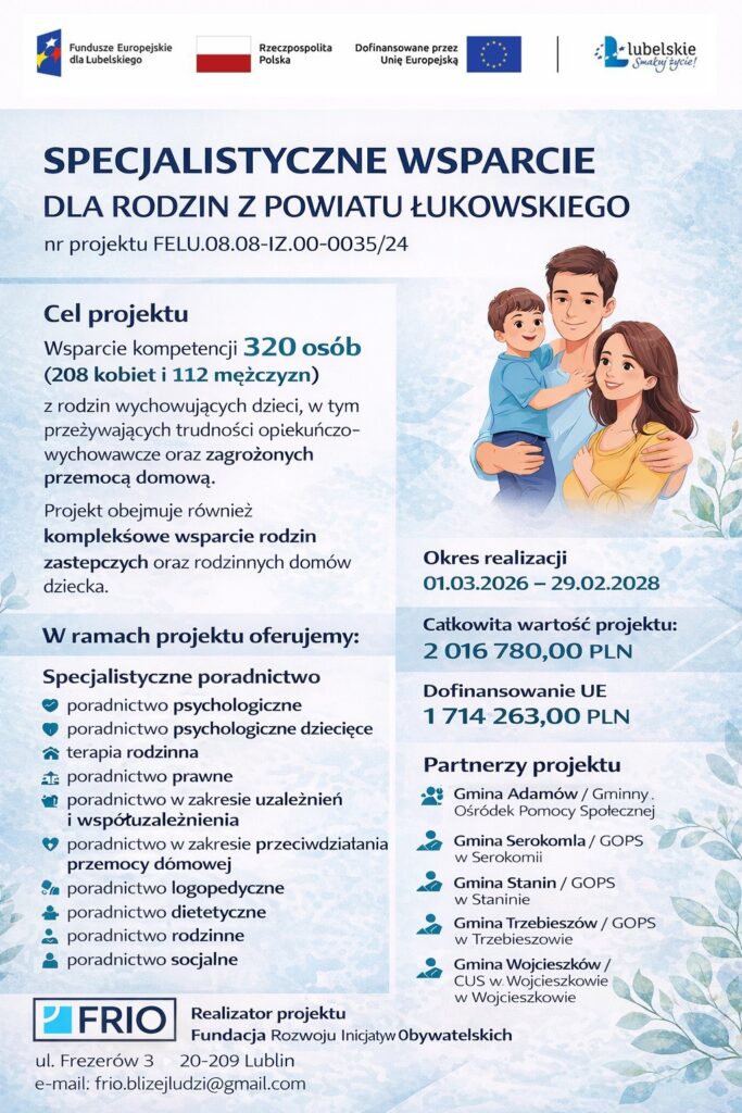 Celem projektu jest wsparcie kompetencji 320osób (w tym 208kobiet i 112mężczyzn) z rodzin wychowujących dzieci, w tym przeżywających trudności opiekuńczo-wychowawcze oraz w zakresie przeciwdziałania przemocy w rodzinie oraz realizację kompleksowego wsparcia już istniejących rodzin zastępczych lub rodzinnych domów dziecka poprzez specjalistyczne usługi w okresie 01.03.2026-29.02.2028r. na terenie Gmin Adamów, Serokomla, Stanin, Trzebieszów i Wojcieszków.